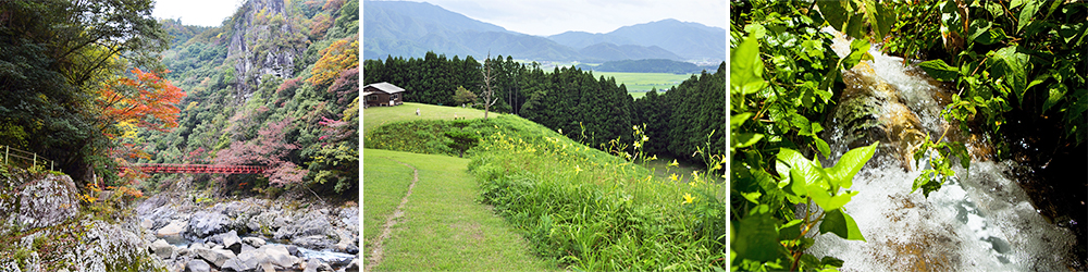 十種ケ峰など1000メートル級の山々に囲まれた緑あふれるさわやかな稲田。多くの名峰、霊山からの清水がせせらぎ、沢となり沃地へそそがれ稲の活力となります。このきれいな水こそあとう米のいのちです。